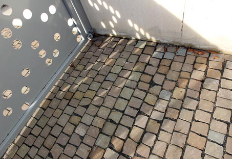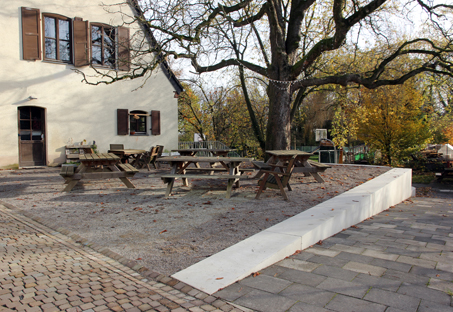 Direkt am Weg zum Rhein gegenüber dem Sürther Marktplatz platziert schafft die erste Stützwand einen Vorplatz, der Auftakt der Sequenz der fünf Innenräume des Pavillon ist. Gleichzeitig ermöglich die Wand zum Markt hin die barrierefreie Erschließung und bietet Sitzgelegenheiten. Die Rundung leitet auf das Eingangstor. Dahinter liegt ein Freisitz unter einer sehr schönen großen Kastanie. Hier muß eine vorhandene Stützwand auf Grund der Baufälligkeit ersetzt werden. Eine neue Sitztreppe anstatt der Wand und ermöglicht nun eine großzügig Verbindung in den Garten hin zum Rhein. Die Rundung der Wand am Vorplatz wird in der Treppe aufgenommen und leitet in den Garten ein.