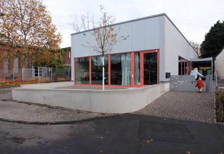 Das an den Rheinauen gelegene Jugendhaus, einer der wichtigen Standorte des Vereins, wird um einen Pavillon für tagestrukturierende, inklusive Angebote für ältere Menschen erweitert. Dadurch bietet sich die Möglichkeit, die Flächen um die Gebäude und den Eingangsbereich barrierefrei zu gestalten. Zwei Stützwänden strukturieren die Freiräume. Ein Thema des Ortes - der Hochwasserschutz mit der großen Sperrwand - wird neu interpretiert.
