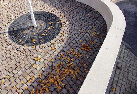 Direkt am Weg zum Rhein gegenüber dem Sürther Marktplatz platziert schafft die erste Stützwand einen Vorplatz, der Auftakt der Sequenz der fünf Innenräume des Pavillon ist. Gleichzeitig ermöglich die Wand zum Markt hin die barrierefreie Erschließung und bietet Sitzgelegenheiten. Die Rundung leitet auf das Eingangstor. Dahinter liegt ein Freisitz unter einer sehr schönen großen Kastanie. Hier muß eine vorhandene Stützwand auf Grund der Baufälligkeit ersetzt werden. Eine neue Sitztreppe anstatt der Wand und ermöglicht nun eine großzügig Verbindung in den Garten hin zum Rhein. Die Rundung der Wand am Vorplatz wird in der Treppe aufgenommen und leitet in den Garten ein.