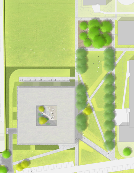 Die rechtwinkelige Logik der Hochschulbauten, ausgehend vom Hauptgebäude, wird aufgenommen und fortgeführt. Neu ist die Haltung zum weiteren Kontext: Die Hochschule erhält zur Straße Obergath eine repräsentative Adresse und tritt damit in Krefeld stärker in Erscheinung. Die Verbindung zum Bestand wird über einen Park, der „Grünen Mitte“, hergestellt. Diagonale Wege schaffen direkte Verbindungen zwischen den umgebenden Bauten. Gleichzeitig öffnet sich der Park zur Stadt hin und präsentiert den Neubau zur Obergath. Die einladende Geste wird bis zur Straße fortgeführt. Campus und Stadt werden verwoben.